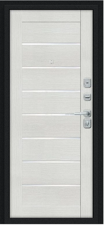 Надежная входная Дверь Браво Техно/BChrome Букле черное/Bianco Melinga премиум класса по цене 35 071 руб. Большая толщина стали защитит от проникновения в ваш дом, квартиру или коттедж. Используется очень качественная фурнитура: замки, цилиндры, ручки, защелки. Покрытие и отделка двери изготовлено под внимательным контролем производителя. Дверь имеет долгий срок службы и гарантию.